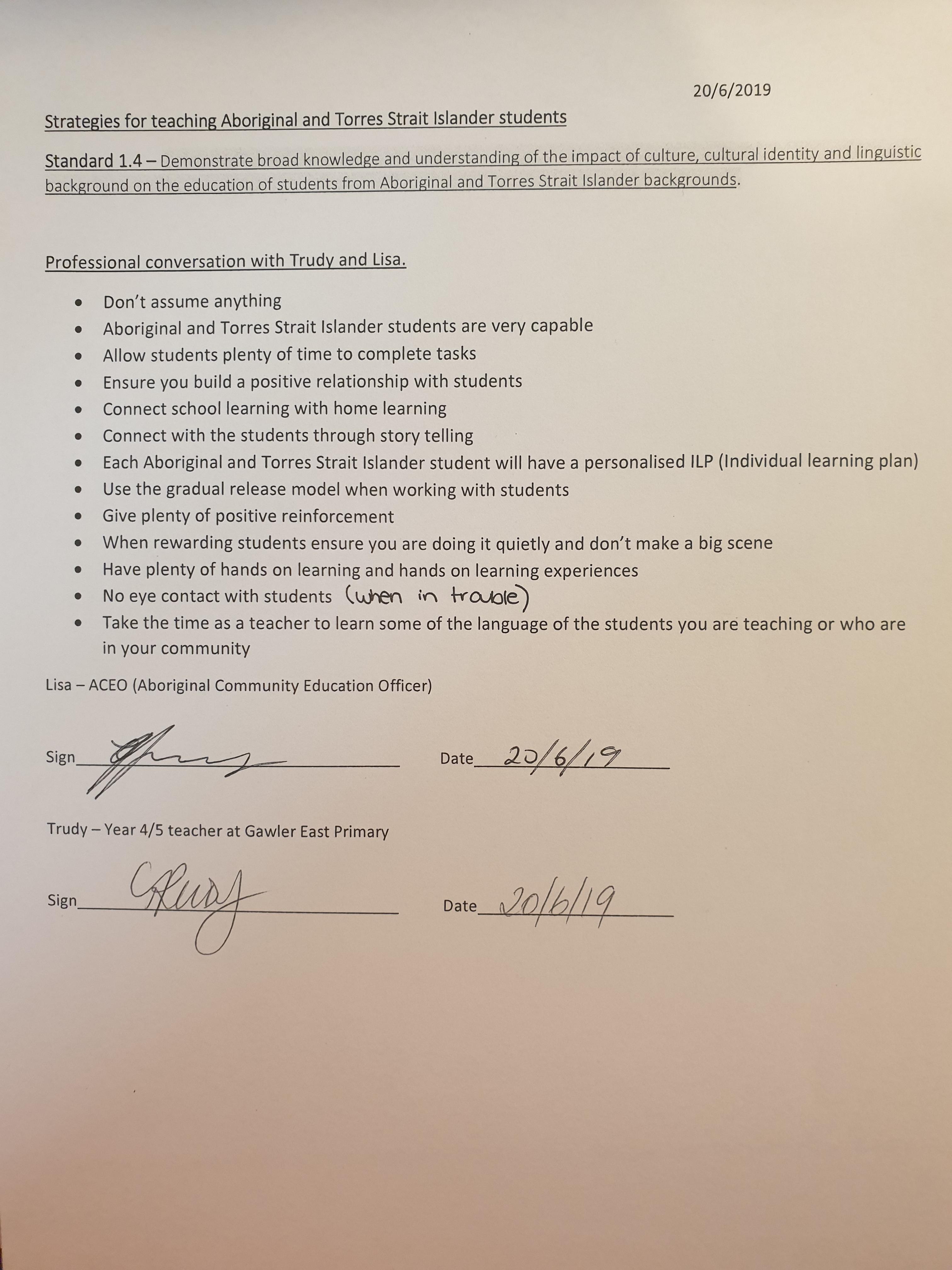 During Professional Experience 3 I sat down and had a professional conversation with the school's Aboriginal Community Education Officer (ACEO) along with a year 4/5 teacher. We spoke about Aboriginal and Torres's Strait Islander students and how best to support them within the school community.