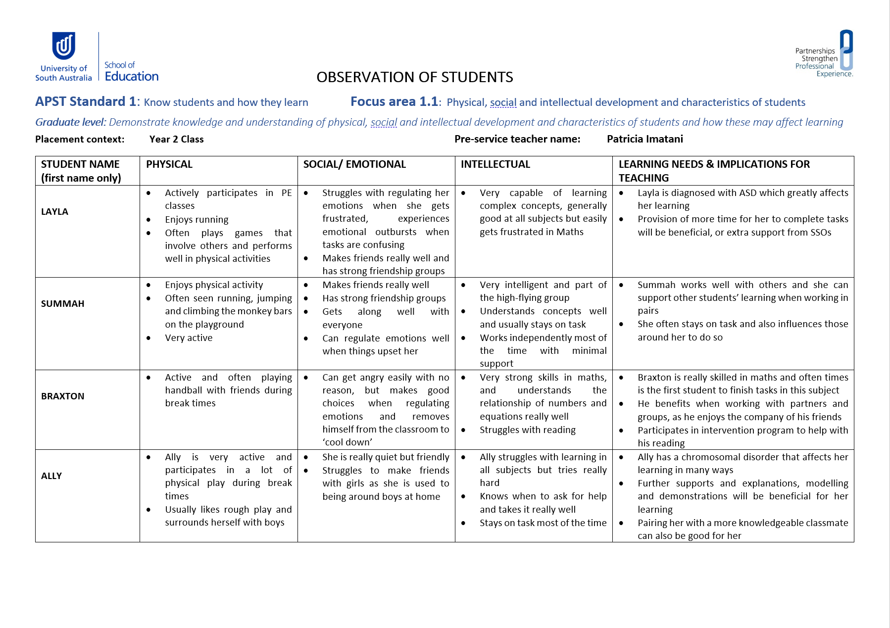 The evidence provided above is a table summary I created from observations, of five students and their physical, social/emotional and intellectual development and characteristics and how these might affect their learning and what implications would need to be considered for my teaching. It is important to know my students and acknowledge that they all have varying ‘funds of knowledge’ which are accumulated and culturally developed knowledge and skills they bring to the classroom (Moll cited in Zipin, Sellar & Hattam 2012, p. 181). Knowing students holistically allowed me to plan for the students who had additional needs and become prepared for any problem behaviours that could occur.