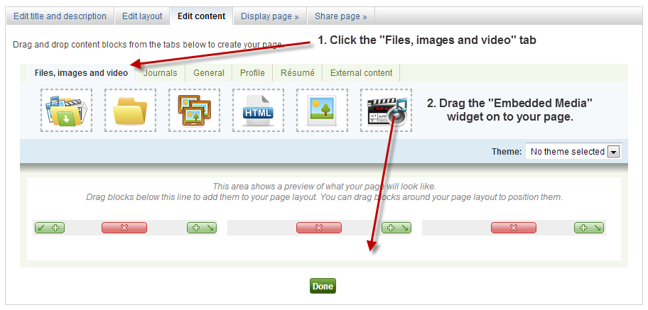 Once you have created a page and copied your mp4 file from your mobile device to your computer, drag the "Embedded Media" widget on to the page into the position you want the video player to be displayed.